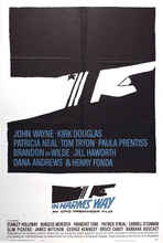 Director: Otto Preminger Writer: Wendell Mayes From novel: Harm's Way by James Bassett Music by: Jerry Goldsmith Producer: Otto Preminger Keywords: Drama, WWII John Wayne plays a naval officer relieved of his duties after the attack on Pearl Harbor, but subsequently receives a promotion to Rear Admiral. His second in command, Kirk Douglas, battles personal daemons with limited success. WWII melodrama, sometimes sentimental, demonstrates war's cost on human relationships. Received Oscar nomination for Best Cinematography.