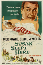 Director: Frank Tashlin Writer: Alex Gottlieb From a play: Susan Slept Here by Steve Fisher and Alex Gottlieb Music by: Leigh Harline Producer: Harriet Parsons Keywords: Comedy, May-September Romance Hollywood scriptwriter Mark Christopher accepts a juvenile delinquent from the Los Angeles Vice Squad to counsel, but did not expect 17-year-old Susan. The presence of this underage girl in his house becomes a matter of great concern for Mark's fiancée, Isabella. This could never be produced today. Received Oscar nominations for Best Original Song "Hold My Hand", and Best Sound Recording. Dick Powell's final film.