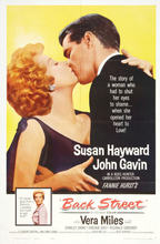 Review by anonymous (posted on 31-Dec-2006) The movie "Back Street," was the movie that I always enjoyed watching with my mother and my sister. We would all cry so much through the movie that we would use a whole row of toilet paper during the movie and it's ending. My favorite part and I had many but my most favorite was the part where Susan Hayward was drawing John Gavin during one of there happiest moments, and then toward the ending, was when she had his children there in her home that Susan and John had picked out together. Susan was sitting in a chair with the children hugging her and the movie showing his picture drawing of him and Susan remembering and trying to change it all in her mind to that day at the airport and what it could have been if she had not been late to catch the plane with John Gavin. Yes, I loved that movie but I am not as lucky as the other reviewer who has a VHS movie to watch whenever. This is a classic movie of all times and I do hope that TCM will present this movie soon so I can hopefully watch it and maybe with my sister, my mother is no longer here to watch this wonderful movie but I know she will be in spirit while we watch.