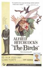Director: Alfred Hitchcock Writers: Daphne Du Maurier; Evan Hunter Keywords: Horror, Explosions Melanie Daniels travels to Bodega Bay in Northern California, to give a pair of lovebirds to Mitch Brenner, a bachelor she fancies. Wild birds, with uncanny organization and surprising ferocity, begin to attack and kill humans, at an increasingly alarming pace. More complex than at first blush; thin as it sounds, one of Hitchcock's best and most iconic films. Absence of a soundtrack serves to heighten the suspense and terror. Received an Oscar nomination for Visual Effects.